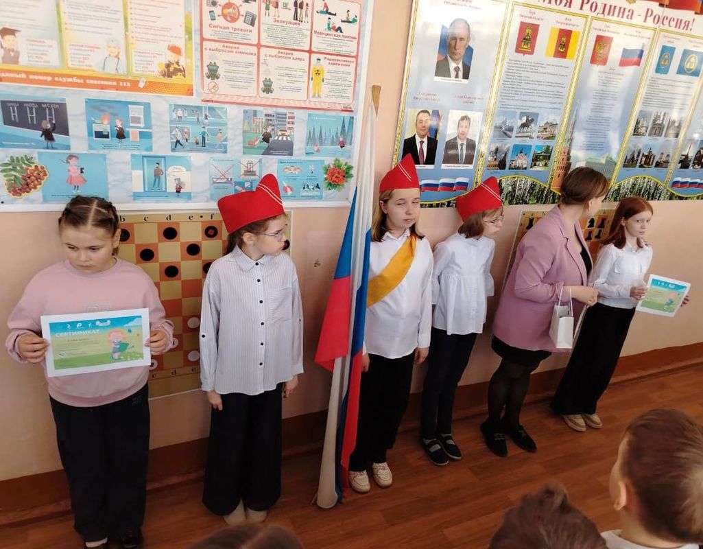 На торжественной линейке в начальной школе учитель начальных классов Ольга Игоревна Федорова вручила сертификаты 2 «А» и 3 «А» классам за успешное прохождение трека "Орлёнок-Эколог". Школьная команда э призеров районной военно-патриотической игры "Зарница" получила сладкие призы.