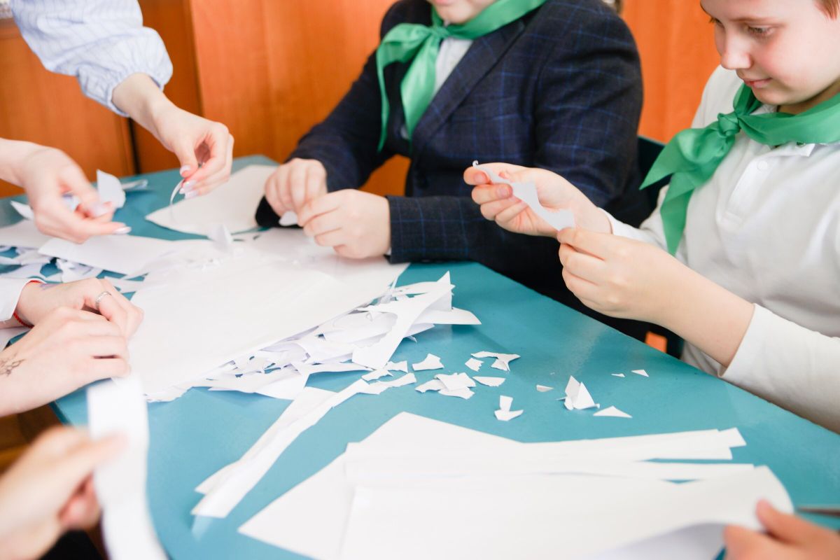 Первые 10 школы создали бумагу своими рками. Для этого они сортировали и измельчали макулатуру, замачивали её, формировали листы, отжимали их и сушили.