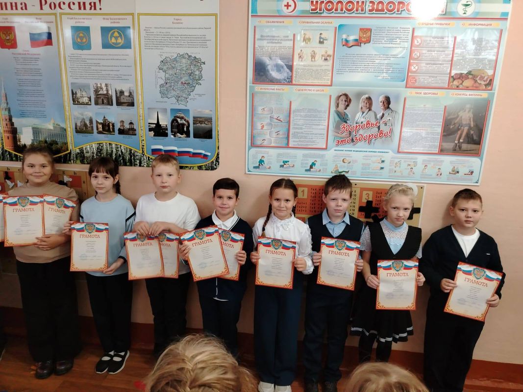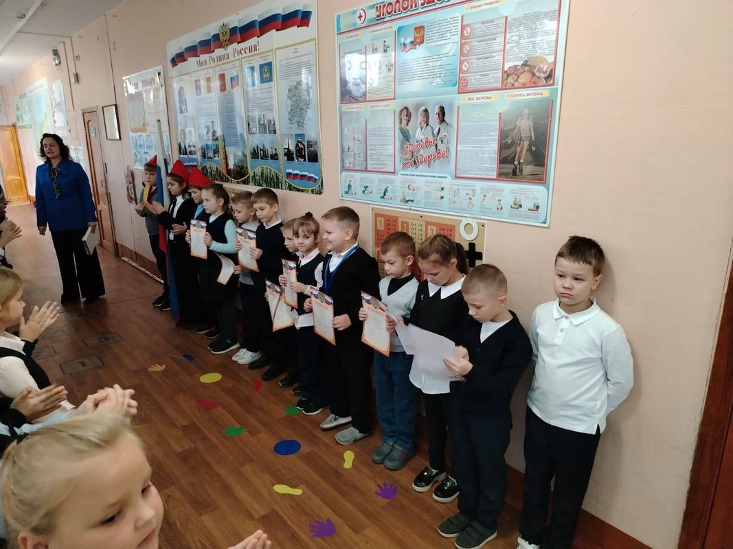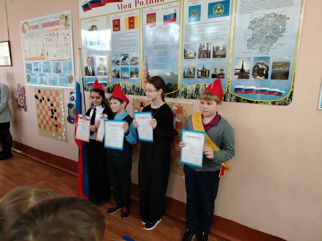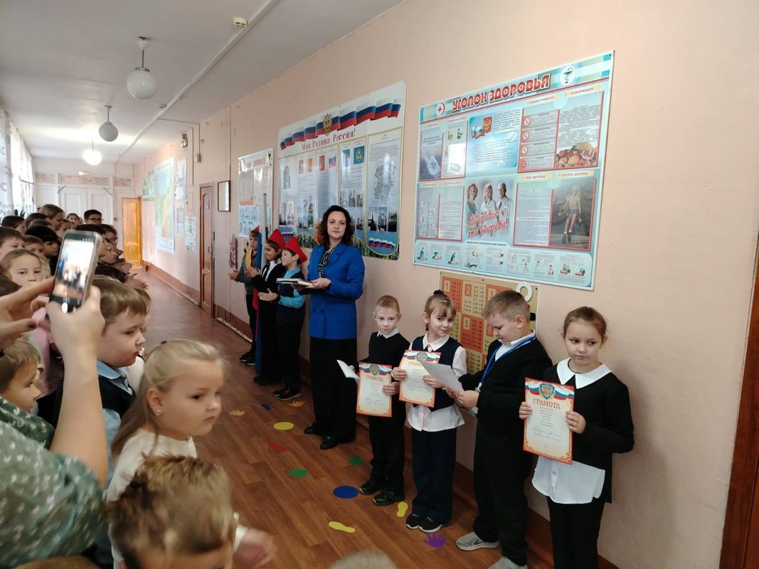 На торжественной линейке Ольга Валерьевна Шевченко вручила грамоты победителям творческого конкурса "Осенняя фантазия" и грамоты победителям школьного этапа Всероссийской олимпиады по русскому языку.