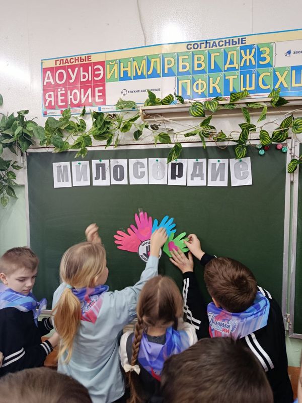 Во время занятий Орлята собирали буквы и составили слово «милосердие». Обсудили добрые дела и роль волонтёров, создали символ волонтёров.